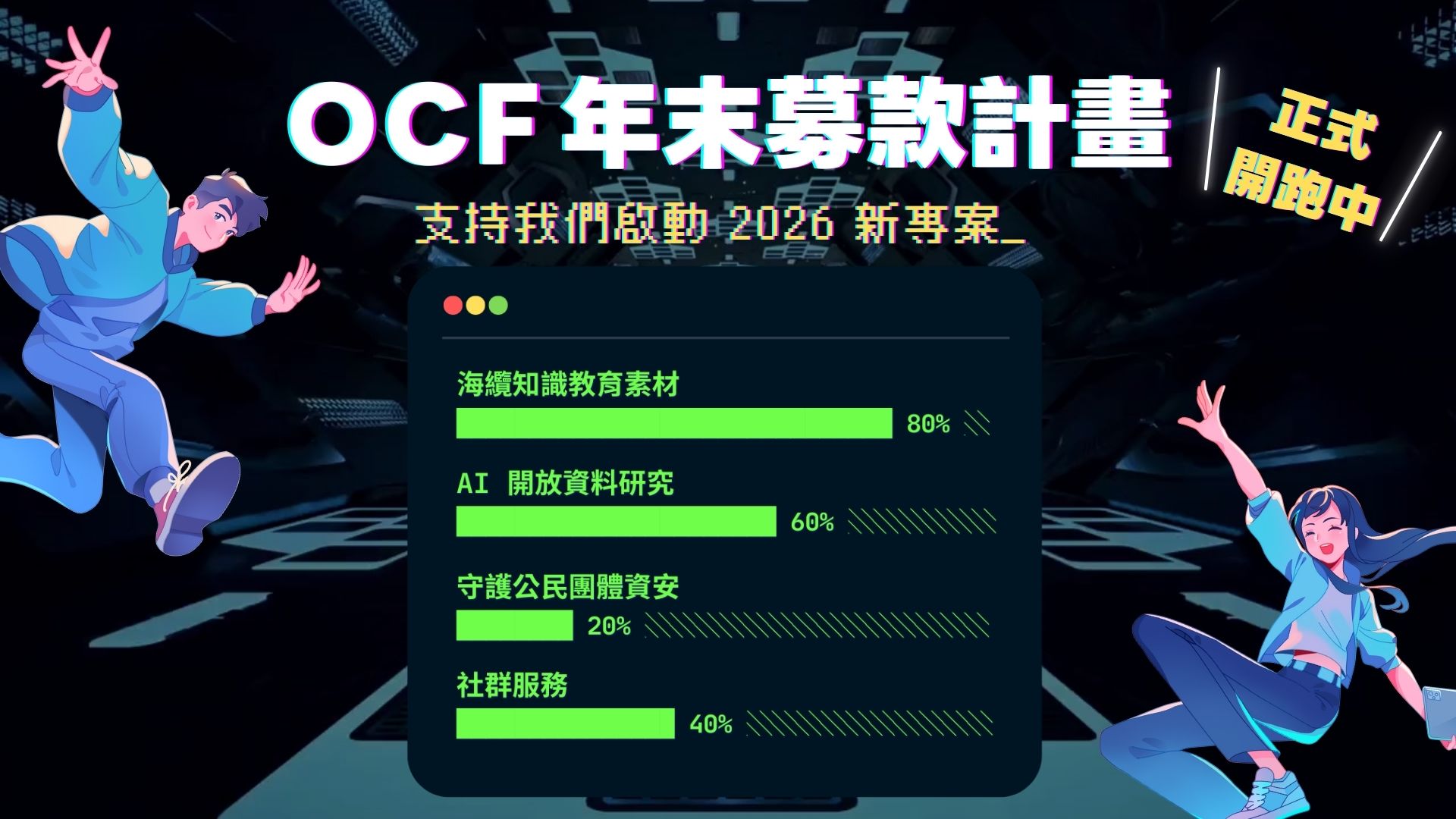 OCF是唯一長期關注開源與數位科技議題的非營利組織。2025 年,對我們而言是特別艱難的一年,面對新興科技的不確定性,以及國內外資金縮減的挑戰,我們還在這裡,不曾退縮。2026 年,這些專案需要你的力量: