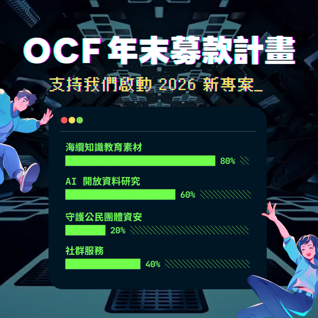 感謝各界的支持與陪伴,OCF 又度過了一個充滿精彩與成長的一年!今年,我們以「開放原始碼、開放資料、開放政府、網路自由、數位人權」五大核心理念,攜手實習生、志工與夥伴,共同完成以下重要成果: